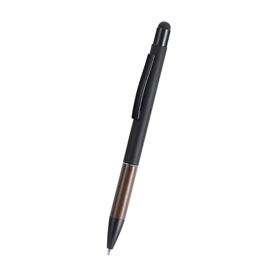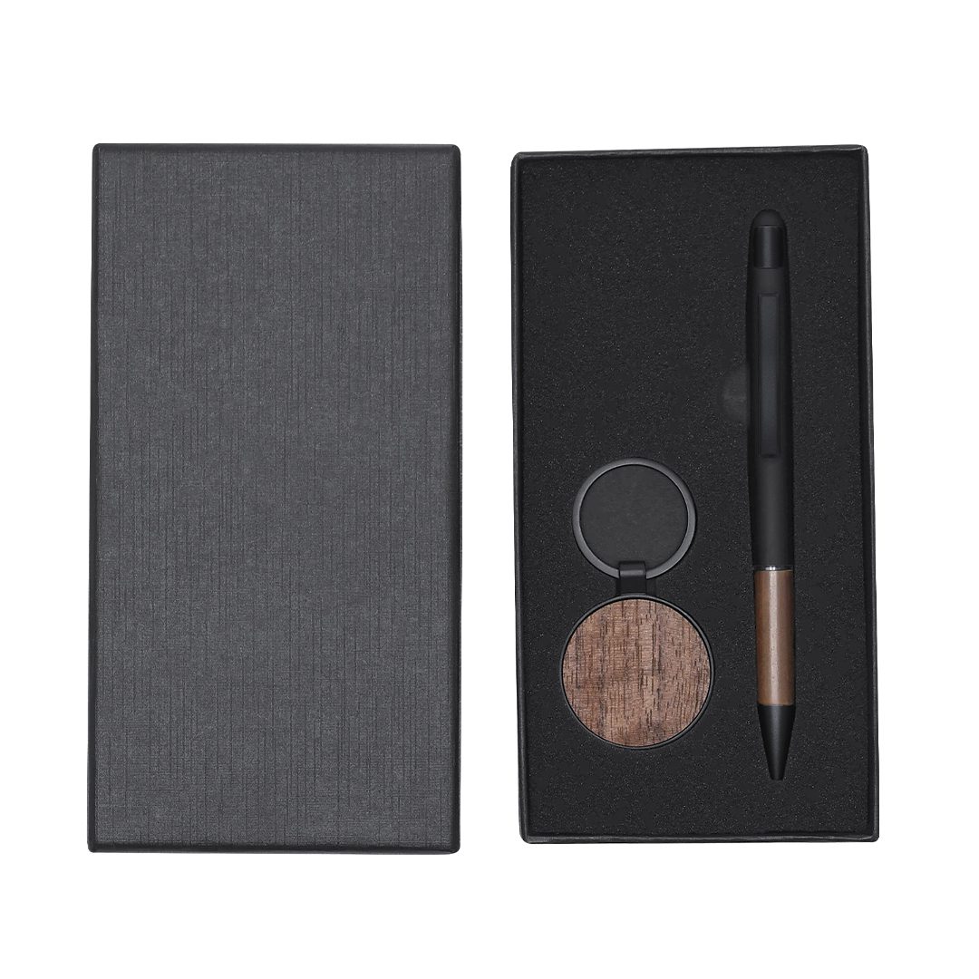 Komplektā ietilpst pildspalva un atslēgu piekars ar matēti melnu apdari un valrieksta koka detaļām. Pildspalvas tinte zilā krāsā.