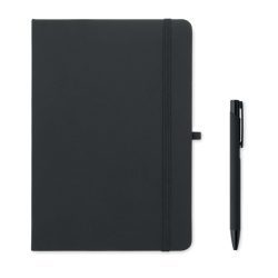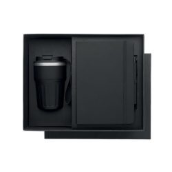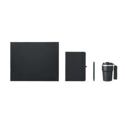 A5 piezīmju grāmatiņa, pārstrādāta alumīnija lodīšu pildspalva, 350 ml dubultsienas pārstrādāta nerūsējošā tērauda glāze ar PP vāciņu un siksniņu dāvanu kastītē. Apstrāde – apdruka vai gravējums.
