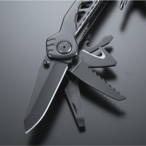 • Daudzfunkcionāls dizains – ietver plakanas un daudzfunkcionālas knaibles, stiepļu griezēju un noņēmēju, 420HC nerūsējošā tērauda naža asmeni, koka zāģi, konservu un vāciņu attaisāmo, koka un metāla vīli un krustveida skrūvgriezi.