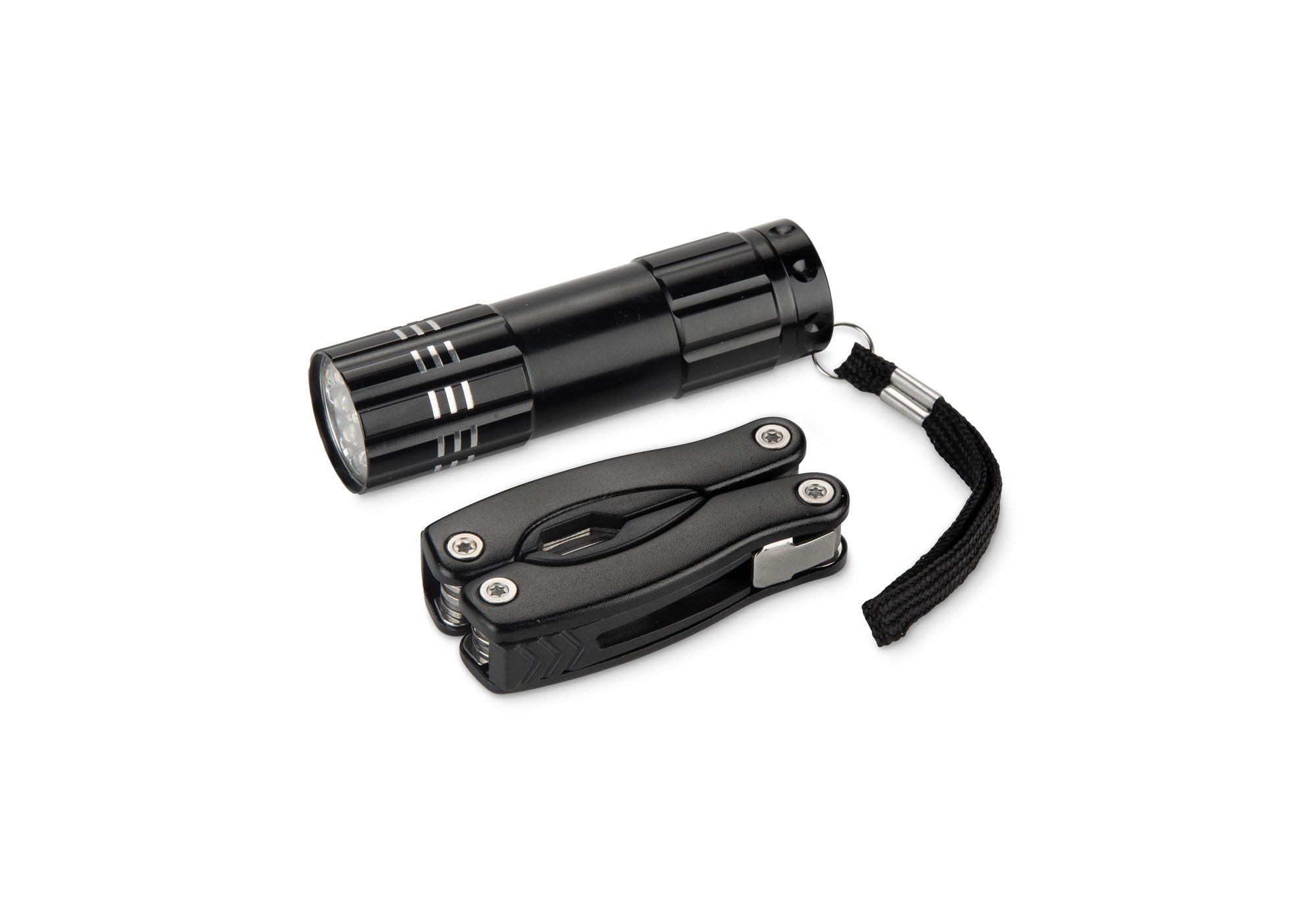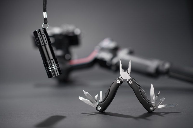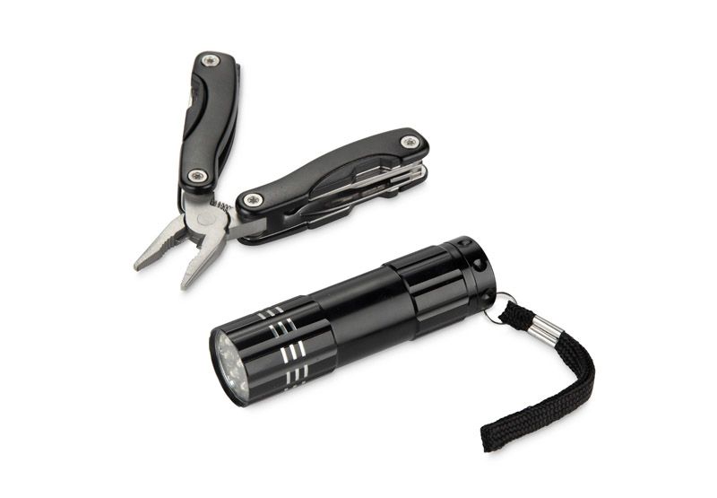 Instrumentu komplekts, kas sastāv no lukturīša un daudzfunkcionāla instrumenta. Tas ir piemērots ceļojumiem, darbam vai mājām. Komplektā ietilpst: knaibles, koka un metāla vīle, pudeļu attaisāmais, zāģis, nazis un krustveida skrūvgriezis, lukturītis. Viss komplekts ir iepakots kartona kastītē.