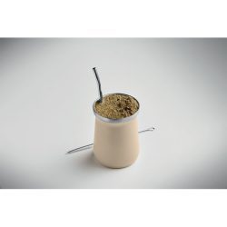 Dubultsienas Yerba Mate tējas krūzīte no nerūsējošā tērauda. Komplektā ietilpst nerūsējošā tērauda bombillas salmiņš un tīrīšanas birste. Tilpums: 240 ml Apstrāde: apdruka vai gravējums.