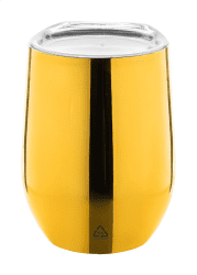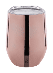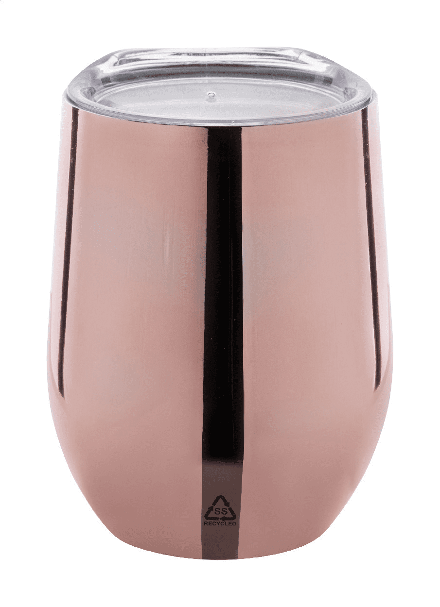 Dubultsienu pārstrādāta nerūsējošā tērauda termokrūze ar spīdīgu metālisku apdari un plastmasas vāciņu. 350 ml.