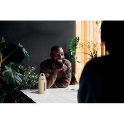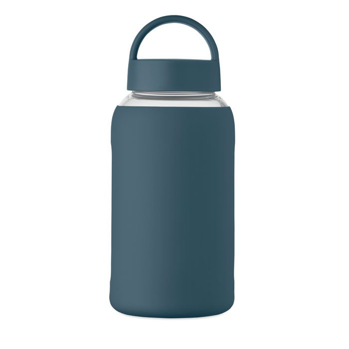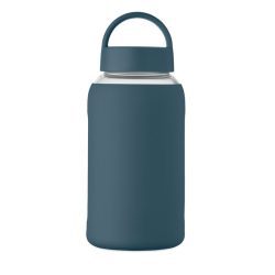 Borosilikāta stikla pudele silikona aizsargapvalkā ar plastmasas vaciņu-rokturi. Apstrāde: apdruka.