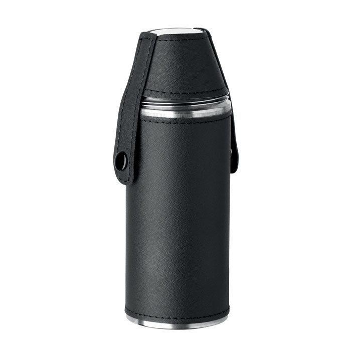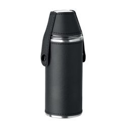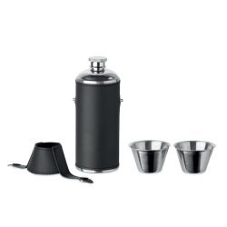 Nerūsējošā tērauda blašķe ar ādas imitācijas apdari un divām metāla glāzītēm. Apstrāde: apdruka vai gravējums.