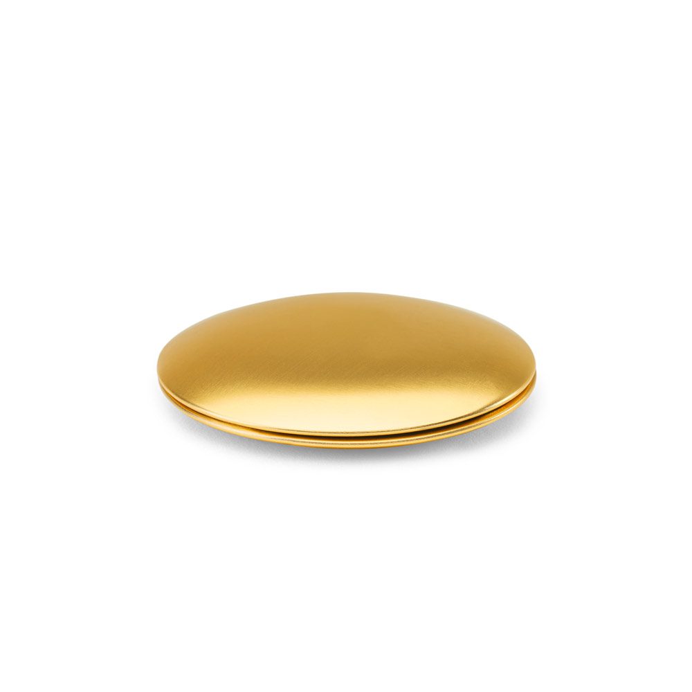 Abpusējs apaļš alumīnija spogulītis ar magnētisku aizdari. Viena spoguļa puse ir parasta, otra – palielinoša. Apstrāde – apdruka.