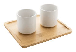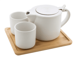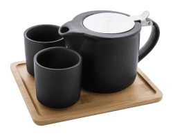 Augstas kvalitātes keramikas tējas komplekts ar matētu apdari. Komplektā ietilpst tējkanna (500 ml) ar nerūsējošā tērauda vāku un tējas sietiņu, divas keramikas glāzes (150 ml). Iepakojums –  kraftpapīra kastīte.