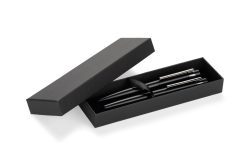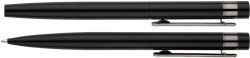 Rakstāmlietu komplektā ietilpst lodīšu un roller pildspalva. Lodīšu pildspalvas tinte ir zilā krāsā. Melna kartona kastīte. Apstrāde: apdruka vai gravējums.
