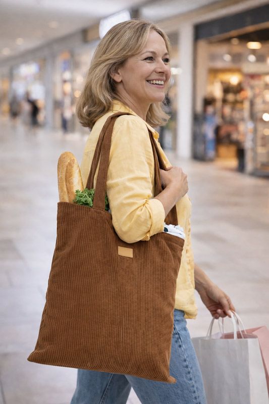 CORDELLA soma, kas izgatavota no kordurojam līdzīga auduma, apvieno maigumu ar izturību un modernu vintage izskatu. Garie rokturi ļauj ērti nēsāt somu uz pleca, un vieglā konstrukcija padara to ideāli piemērotu gan iepirkumu somai, gan ikdienas pilsētas somai. Iešūta zīmola uzšuve ļauj neuzkrītoši izvietot logotipu. Šis ir praktisks un stilīgs modelis ar daudzpusīgu pielietojumu. Apstrāde: apdruka.