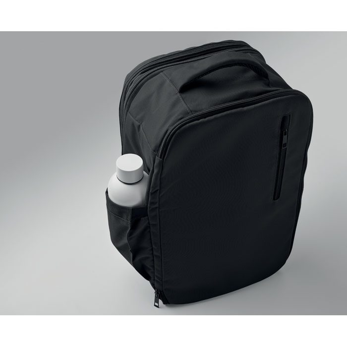 Rokas bagāžas izmēra mugursoma, izgatavota no 600D RPET poliestera ar 180-grādu atvērumu. Aprīkota ar galveno nodalījumu ar divām atvērtām sekcijām, sieta nodalījumu, polsterētu 15 collu klēpjdatora kabatu un bagāžas siksnu. Apstrāde: apdruka.