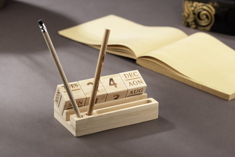 Galda kalendārs – telefona un rakstāmlietu statīvs.  Apstrāde – apdruka vai gravējums.