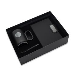 Elegants dāvanu komplekts, kurā ietilpst: keramikas krūze 480 ml ar matēti melnu apdari un metāla elementu; A5 piezīmju bloks  ar lapām rūtiņu rakstā (70 g/m² papīrs) ar cietiem vākiem; melna alumīnija pildspalva. Iepakojums – dāvanu kaste melnā krāsā.