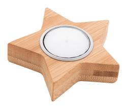 Bambusa Ziemassvētku svečturis sniegpārsliņas, eglītes vai zvaigznītes formā ar vaniļas aromāta tējas sveci. Degšanas laiks: 4 stundas. Iepakota kraftpapīra kastītē.